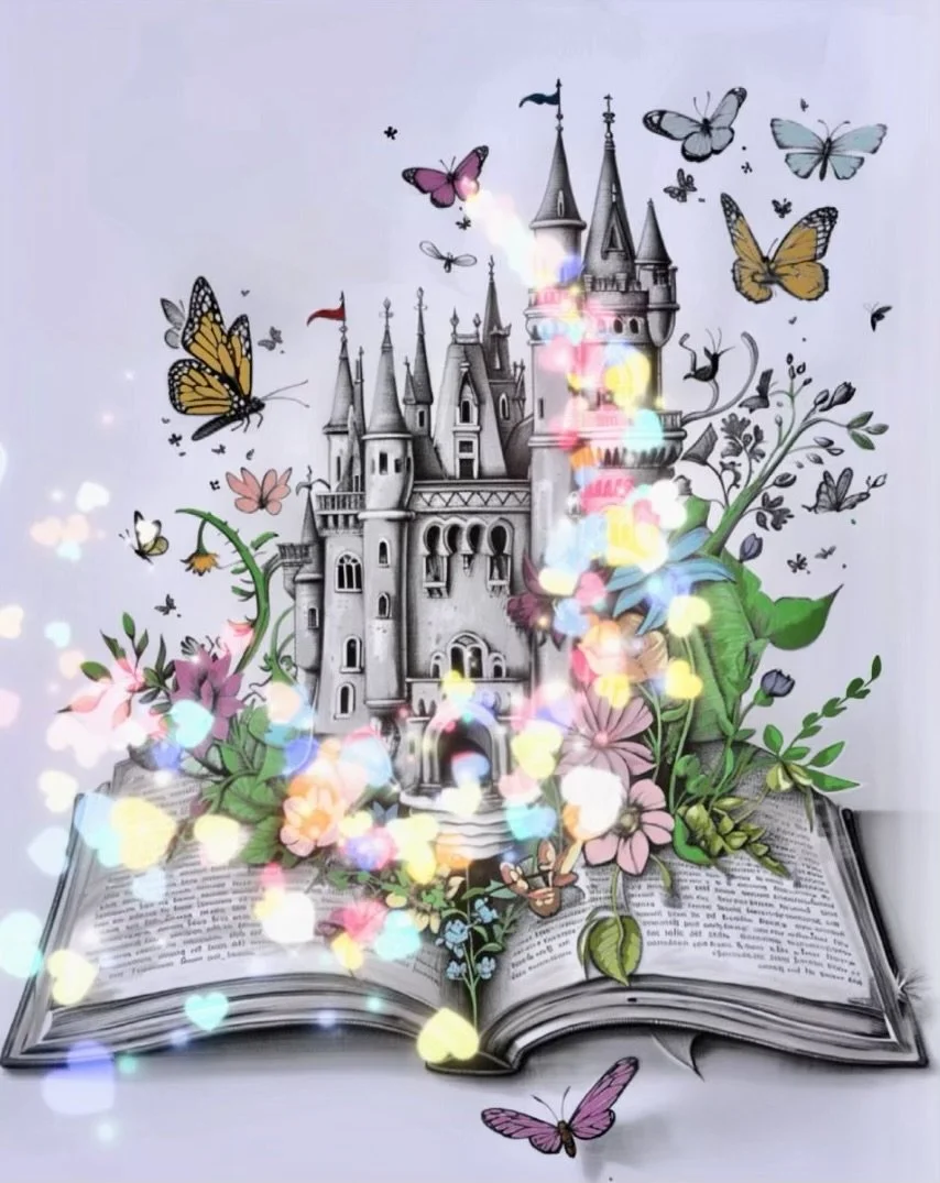 An illustrated castle emerging from an open book, surrounded by colorful flowers and butterflies.