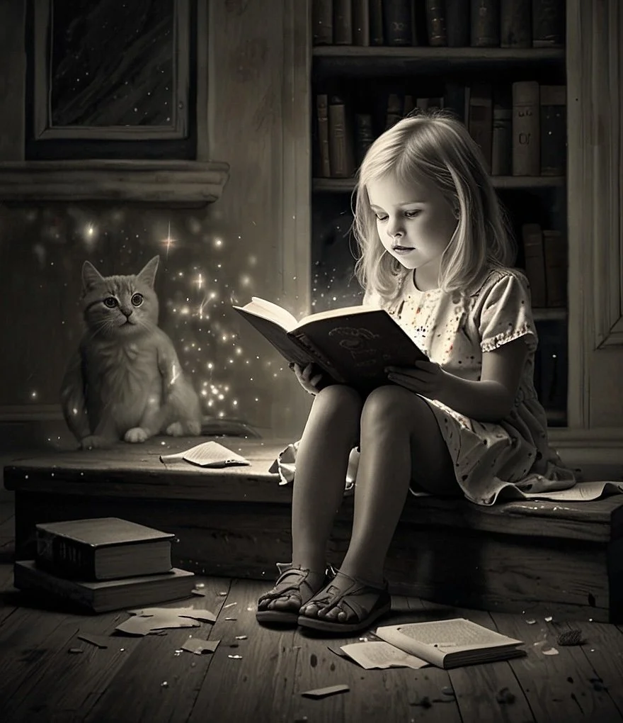 A young girl sits on a wooden bench in a dimly lit room, reading a book with a focused expression. A cheerful cat sits beside her, surrounded by floating sparkles or magic dust. The room has bookshelves and scattered open books and papers on the floor, creating a magical and cozy atmosphere.